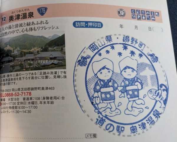 ・25/08/12 :【301-01】記念きっぷゲット。(番号5308)快走路の国道179号沿い、岡山県北部の鏡野町山間部に所在。近隣に奥津温泉の温泉街があり、道の駅の高台から見下ろす事が出来る。奥津温泉や鏡野町では奥津かがみと言う女の子キャラを推しているが、昔からのゆるキャラ・みずりんも推され気味ながら頑張っている。そこそこの広さで、充実した食事処や物産館があって、ドライブの立ち寄りに適した施設。特産品として、しし肉やひらめ(岡山県北部ではあまごの事をこう呼んでいる)と言った都会では味わえないものや、唐麺そばに使用されている姫とうがらしと言う特産もある。ここでしか味わえないブラックベリーババロアは特にお勧めの一品。食事処でも姫とうがらしを使用した辛みそラーメンや、やまめ等の川魚を味わえる。奥津温泉らしいマンホールも道の駅内に設置。ここで岡山県コンプリート。(彦成さん)