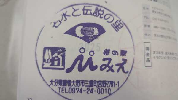 ・24/02/20 :豊後大野市の道の駅5つ目。豊後大野市には道の駅が5つありますが大野と三重は記念きっぷを扱っていません。駅入口にある「みえ」のモニュメントがインパクト大でした。(kohさん)